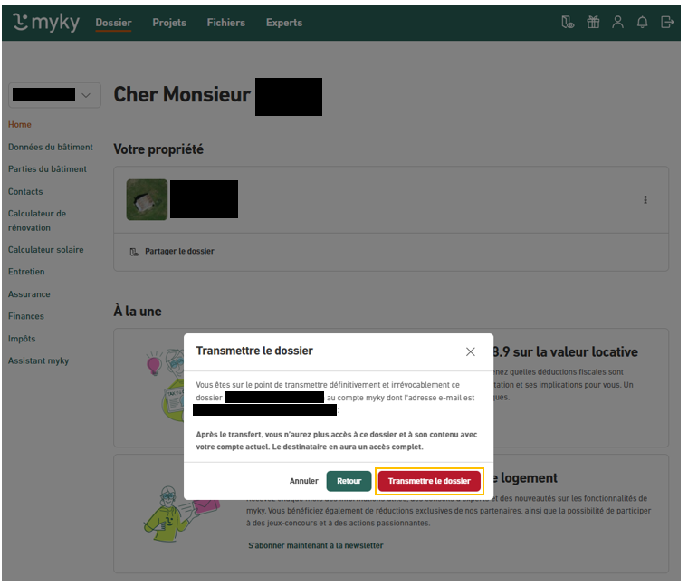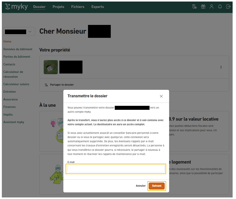 4. Après avoir lu les informations relatives au transfert du dossier, vous pouvez indiquer l'adresse e-mail du dossier vers lequel vous souhaitez transférer ce dossier. Cliquez ensuite sur "Suivant".