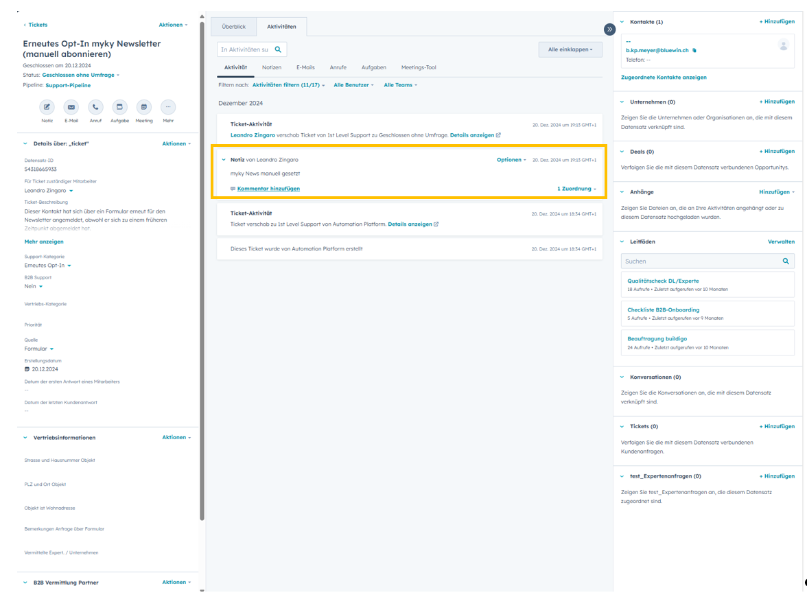 4. Die rechtliche Grundlage, welche in der Ticketbeschreibung erwähnt wurde, auswählen und in die Kommunikationseinwilligung schreiben, dass sich der Kunde erneut für das Abonnement anmelden will.